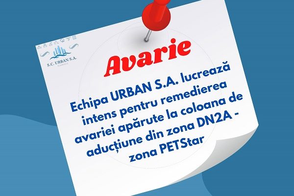 S-a intervenit de urgență pentru remedierea unei avarii la coloana de aducțiune apă, în zona PET Star / DN2A! Alimentarea cu apă este asigurată din sursa de rezervă a...