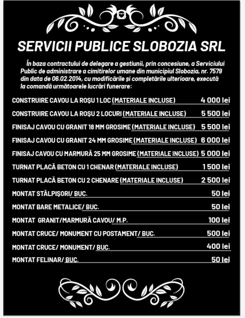 Anunț executare lucrări funerare – Servicii Publice Slobozia SRL