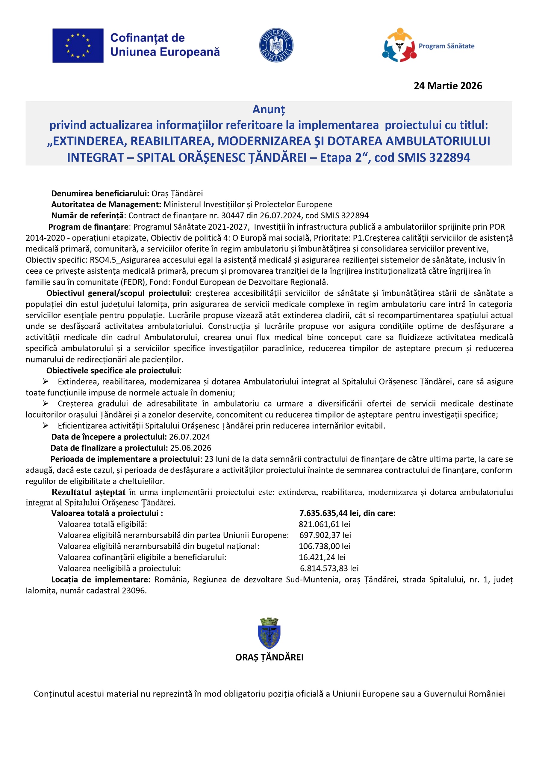 Anunț privind actualizarea informațiilor referitoare la implementarea proiectului: „EXTINDEREA, REABILITAREA, MODERNIZAREA ŞI DOTAREA AMBULATORIULUI INTEGRAT – SPITAL ORĂȘENESC ȚĂNDĂREI – Etapa 2“
