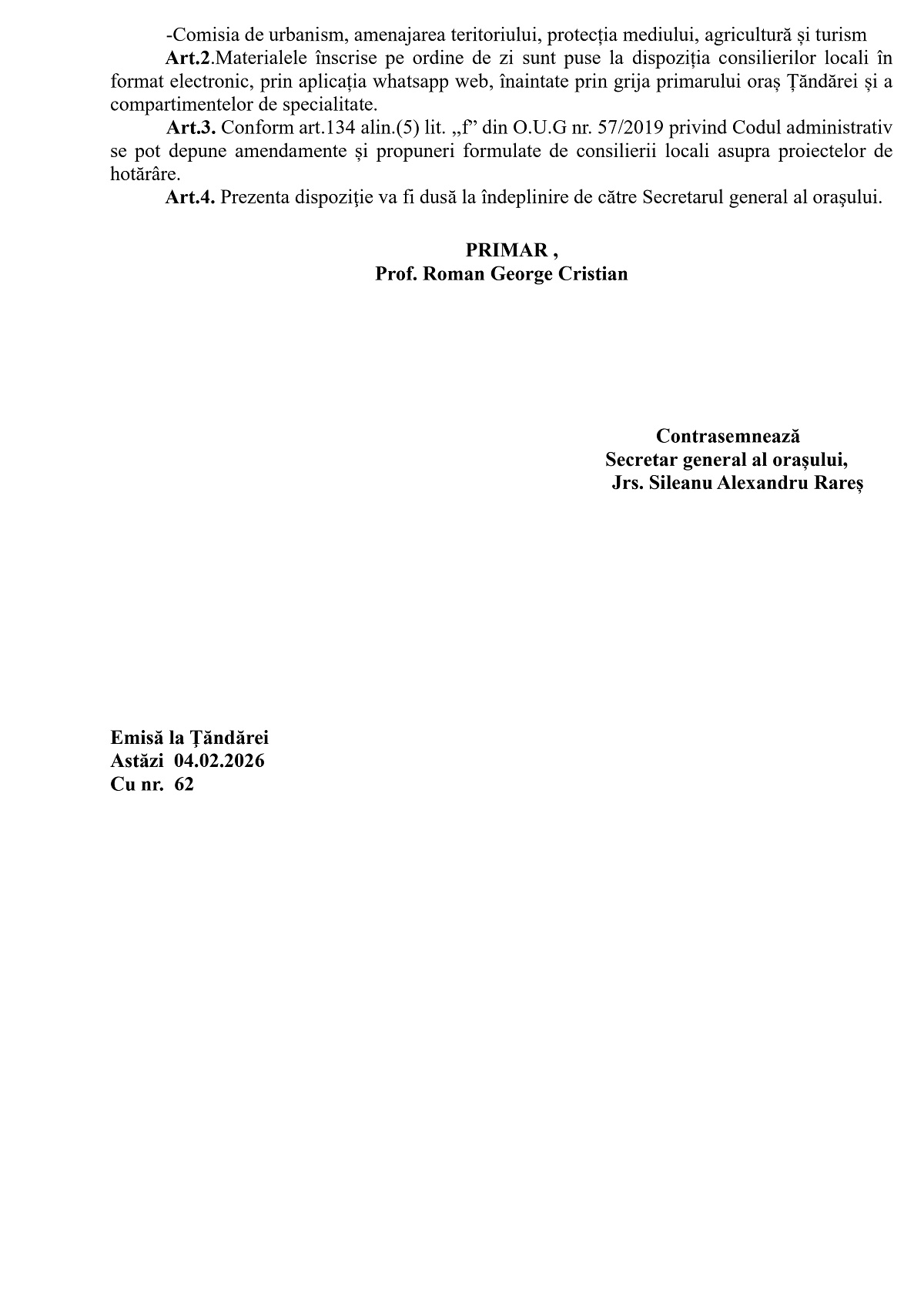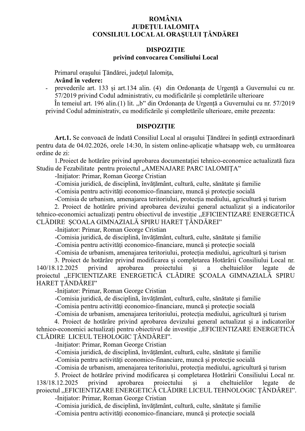 Dispoziție privind convocarea Consiliului Local Țăndărei în ședință extraordinară
