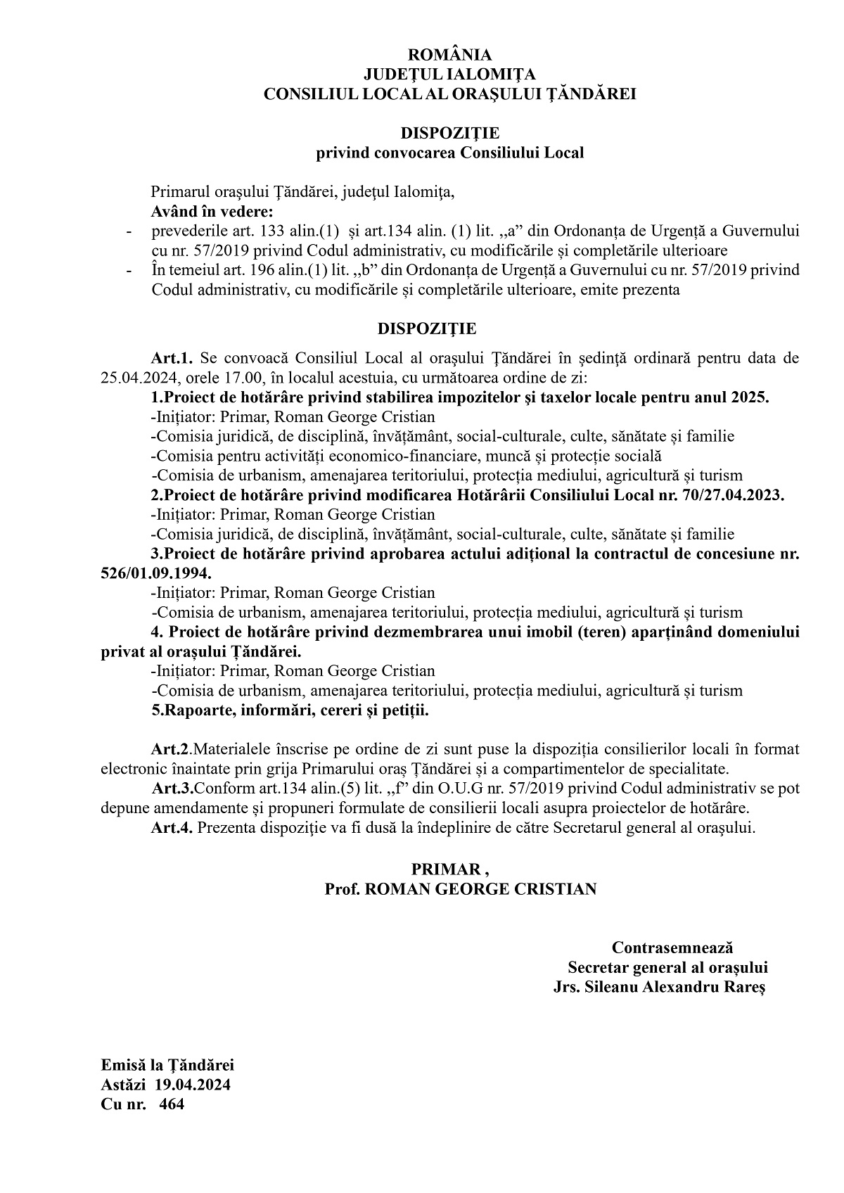 Dispoziție privind convocarea ședinței ordinare a Consiliului Local Țăndărei