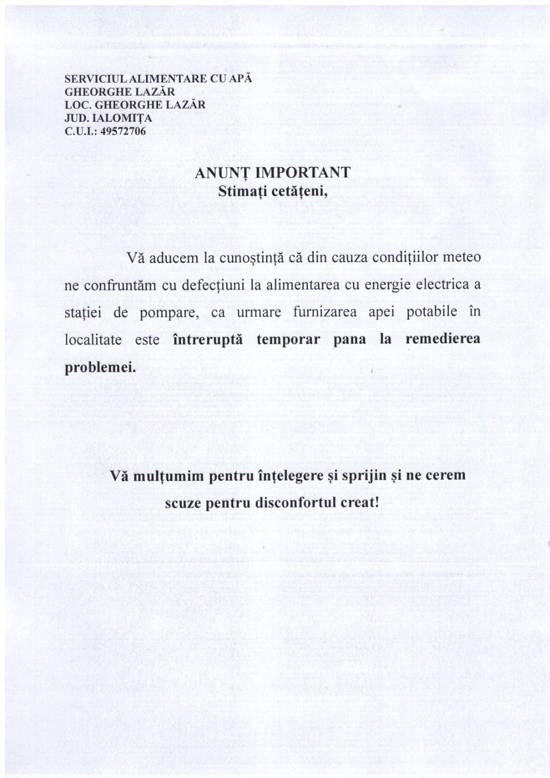 Furnizarea apei potabile, întreruptă temporar în comuna Gheorghe Lazăr