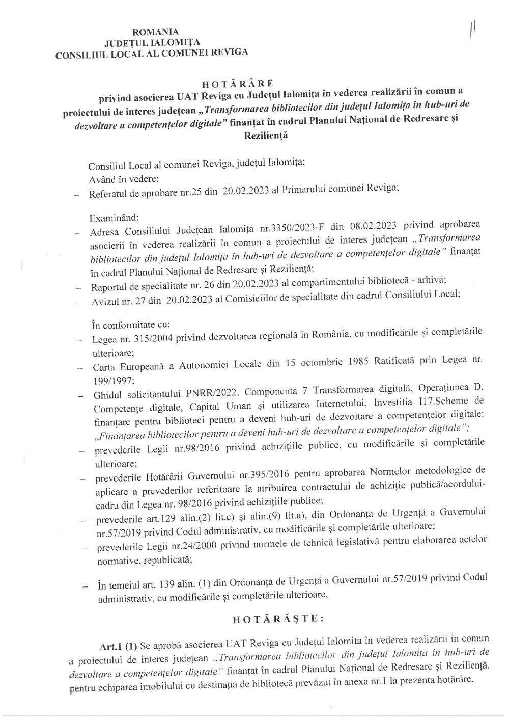 Hotărâre privind asocierea comunei Reviga cu județul Ialomița pentru realizarea proiectului de interes județean ”Transformarea bibliotecilor din județ în hub-uri de dezvoltare a competențelor digitale”