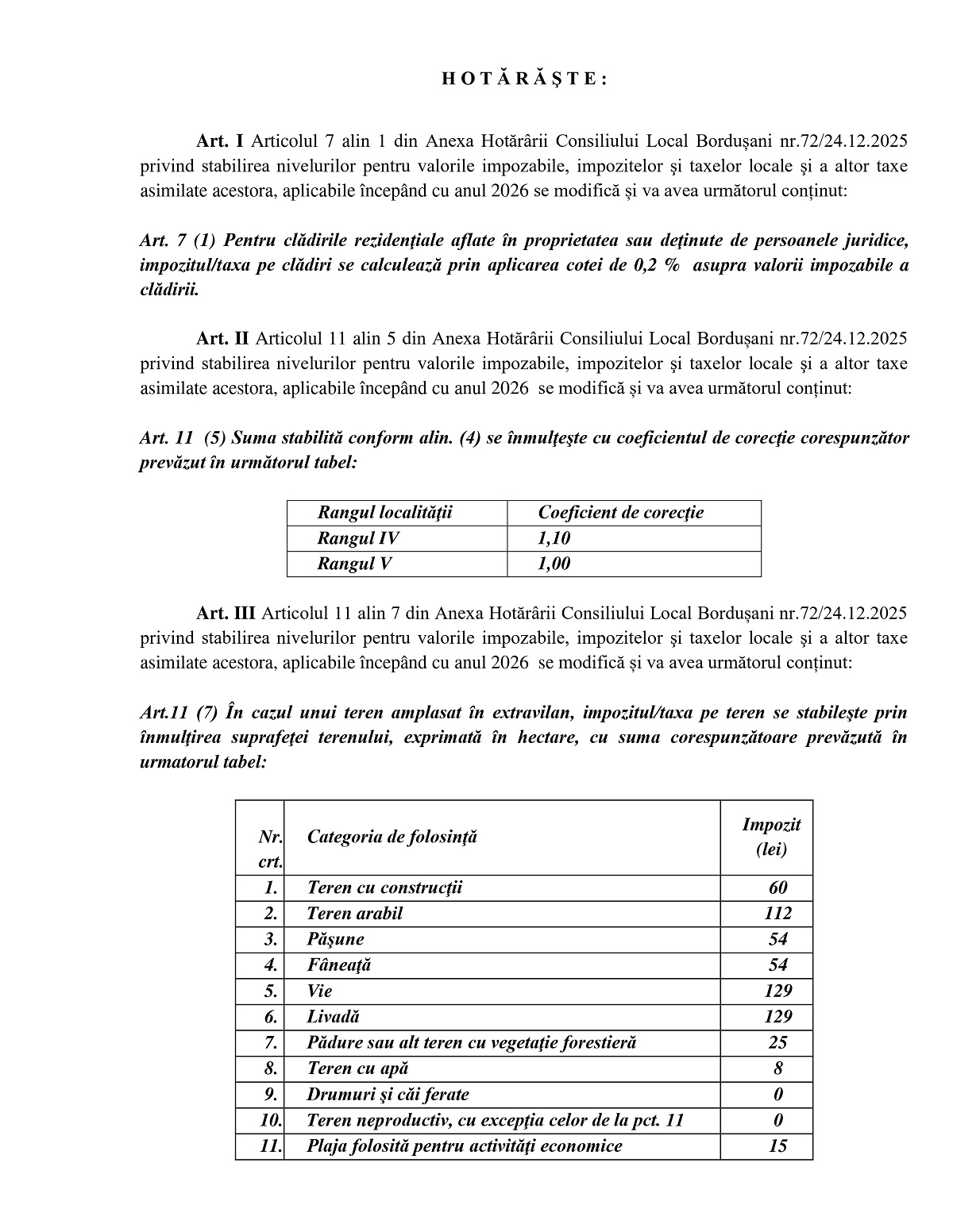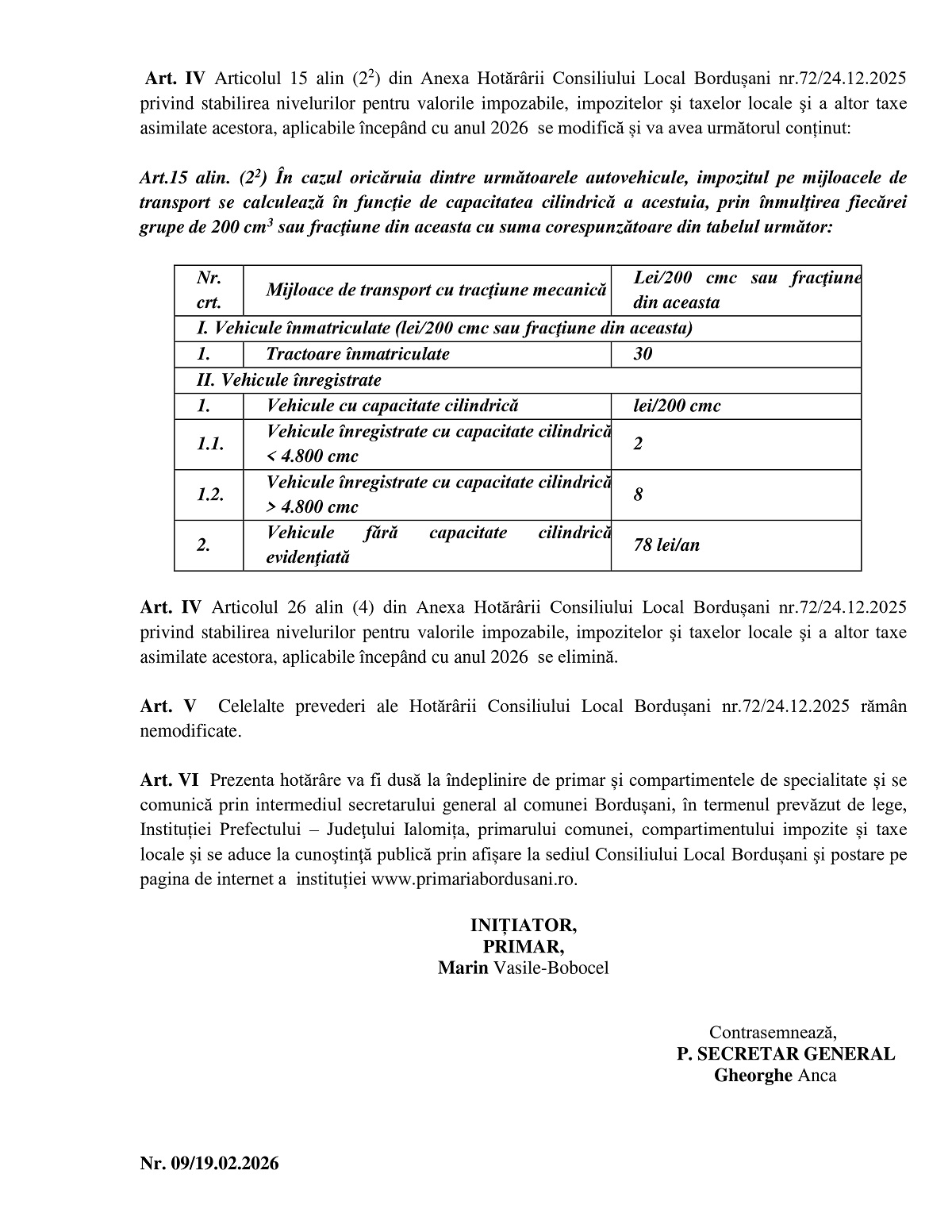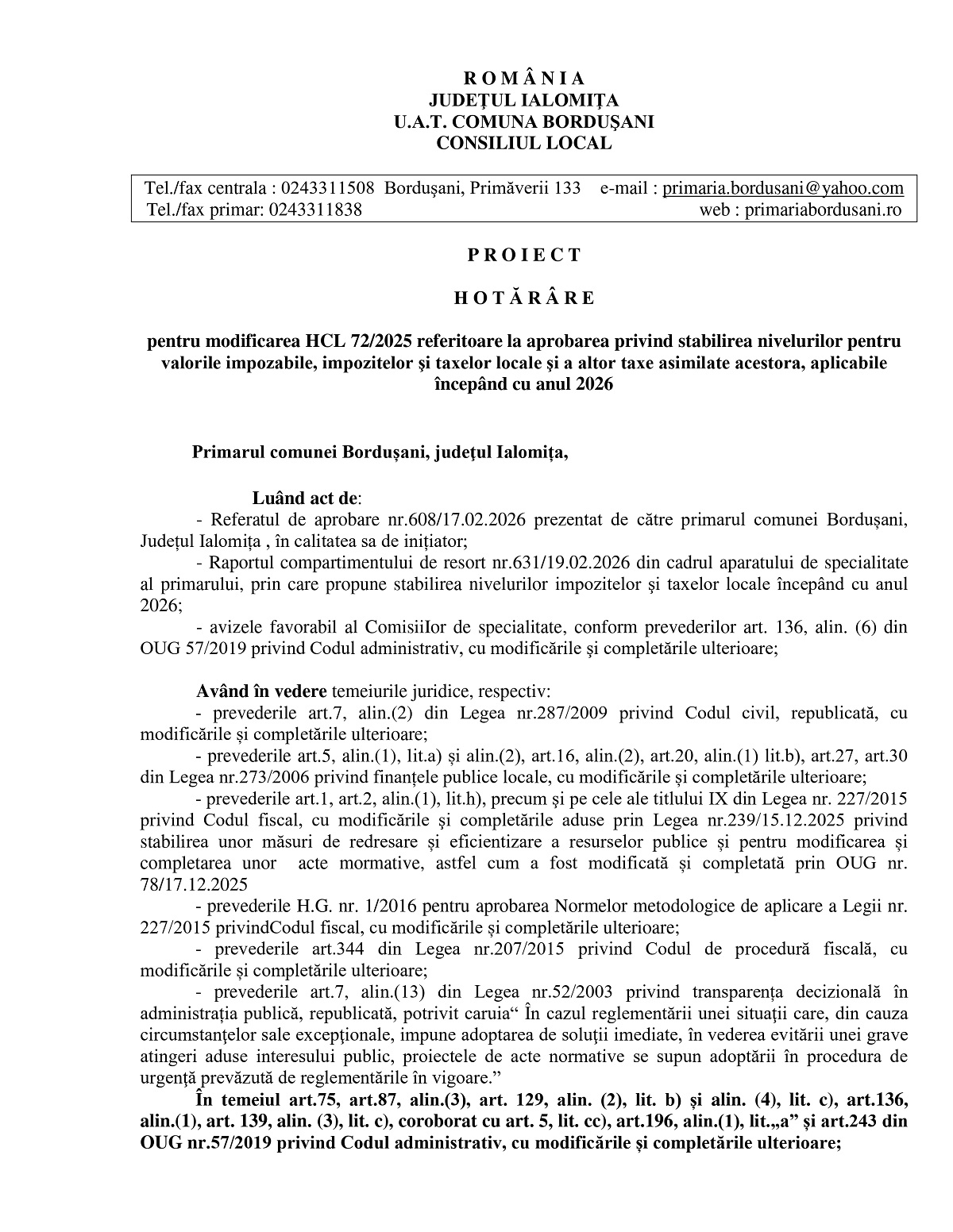 Hotărârea Consiliului Local Bordușani privind modificarea HCL 72/2025 referitoare la stabilirea valorilor impozitelor și taxelor locale pentru anul 2026