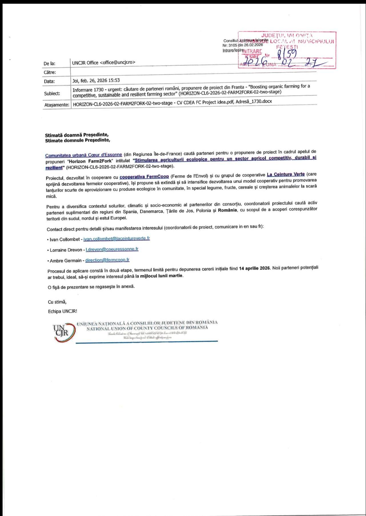 Consiliul Județean Ialomița a transmis către Primăria municipiului Fetești o informare privind căutarea de parteneri români pentru un proiect european în agricultură ecologică, care poate aduce fermierilor sprijin de dezvoltare și acces la un model cooperativ testat.