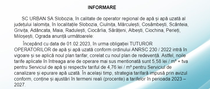 Noua strategie de tarifare aferentă planului de afaceri pentru investițiile în infrastructura de apă și apă uzată dezvoltate de SC URBAN SA Slobozia