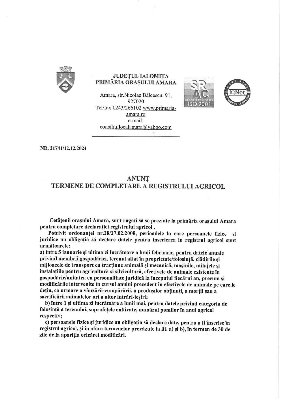 Primăria Amara: Anunț termene de completare a registrului agricol