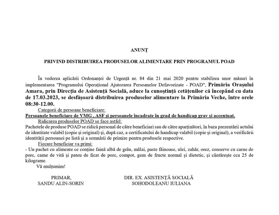 Primăria Amara: Se distribuie produsele alimentare prin programul POAD
