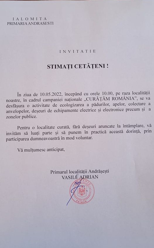 Primăria Andrășești: Activitate de ecologizare în cadrul campaniei ”Curățăm România”
