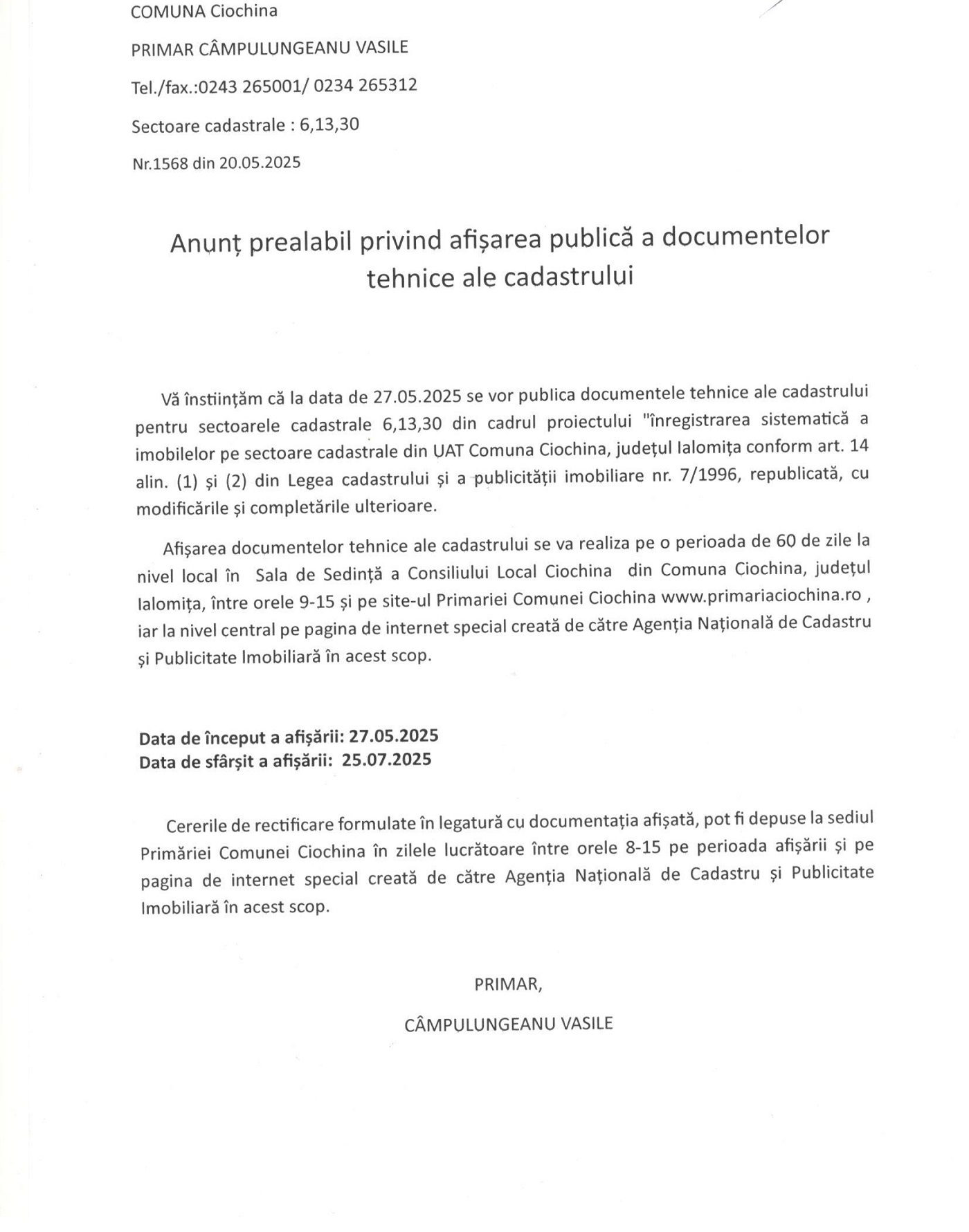 Primăria Ciochina: Anunț prealabil privind afișarea publică a documentelor tehnice ale cadastrului