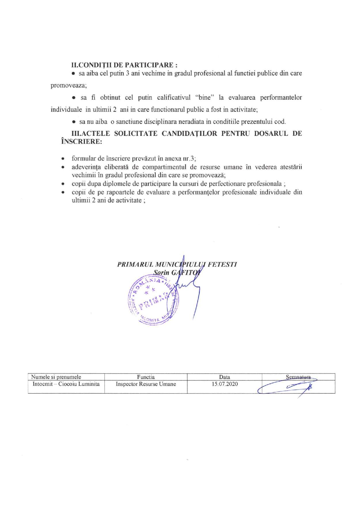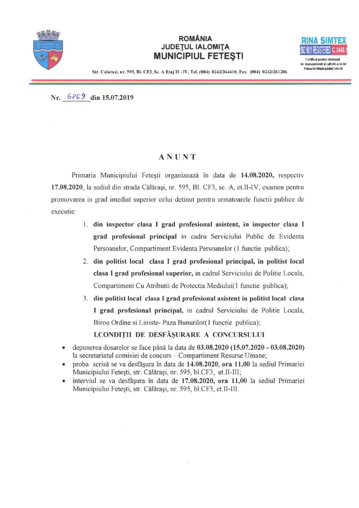 Primăria Feteşti: Anunţ privind organizarea examenului pentru promovarea în grad