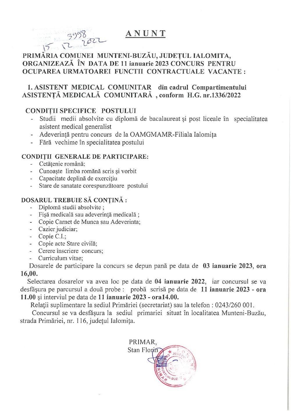 Primăria Munteni-Buzău organizează concurs pentru ocuparea funcției de asistent medical comunitar