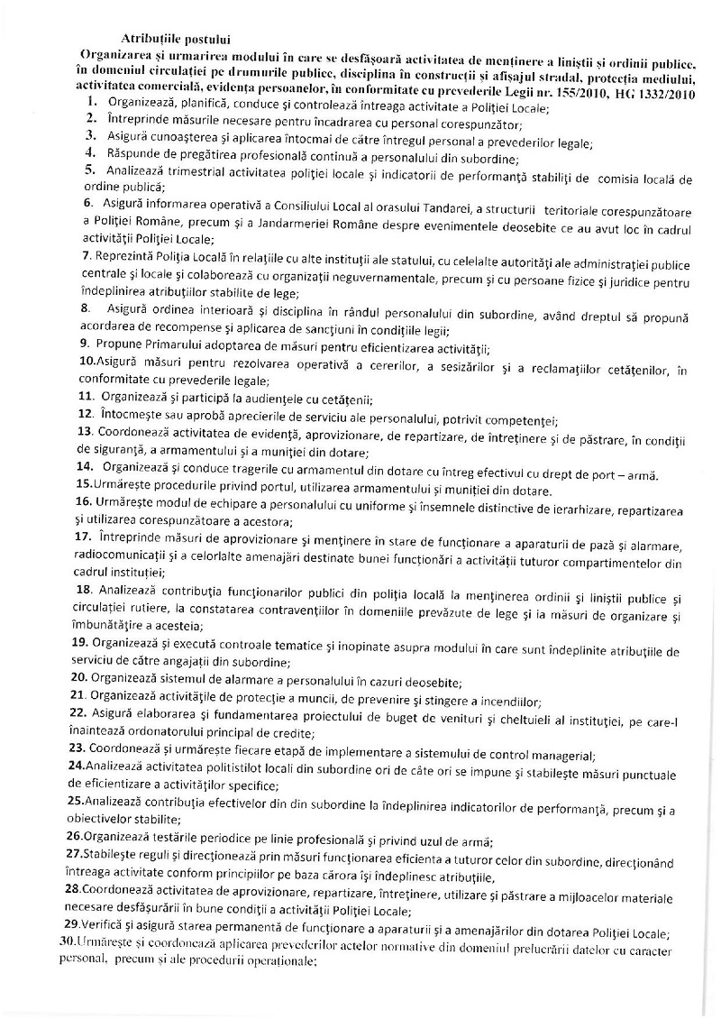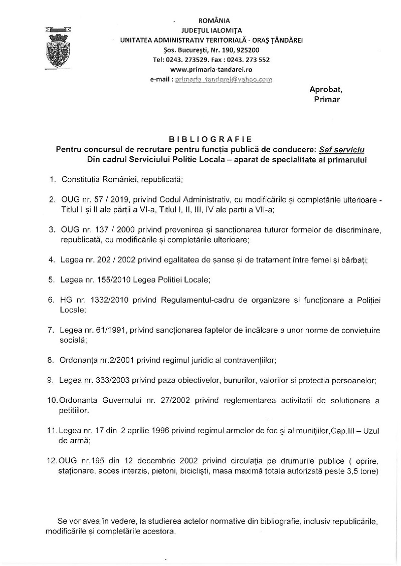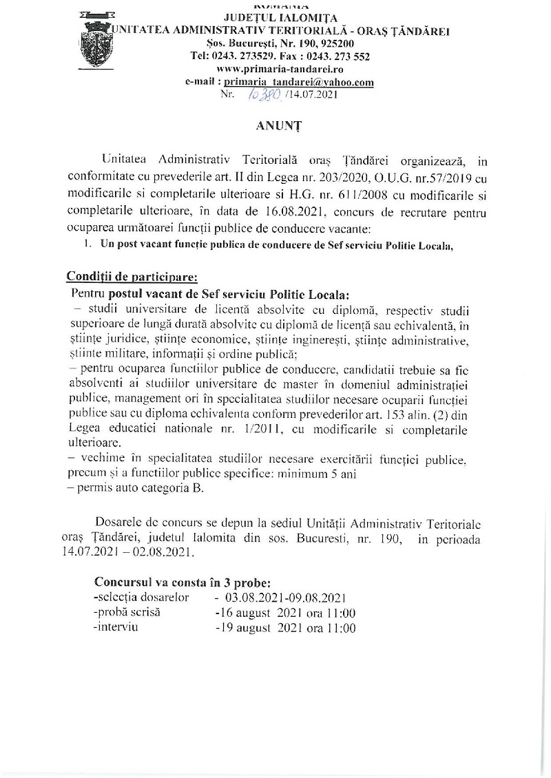 Primăria Țăndărei: Anunț concurs șef Poliția Locală