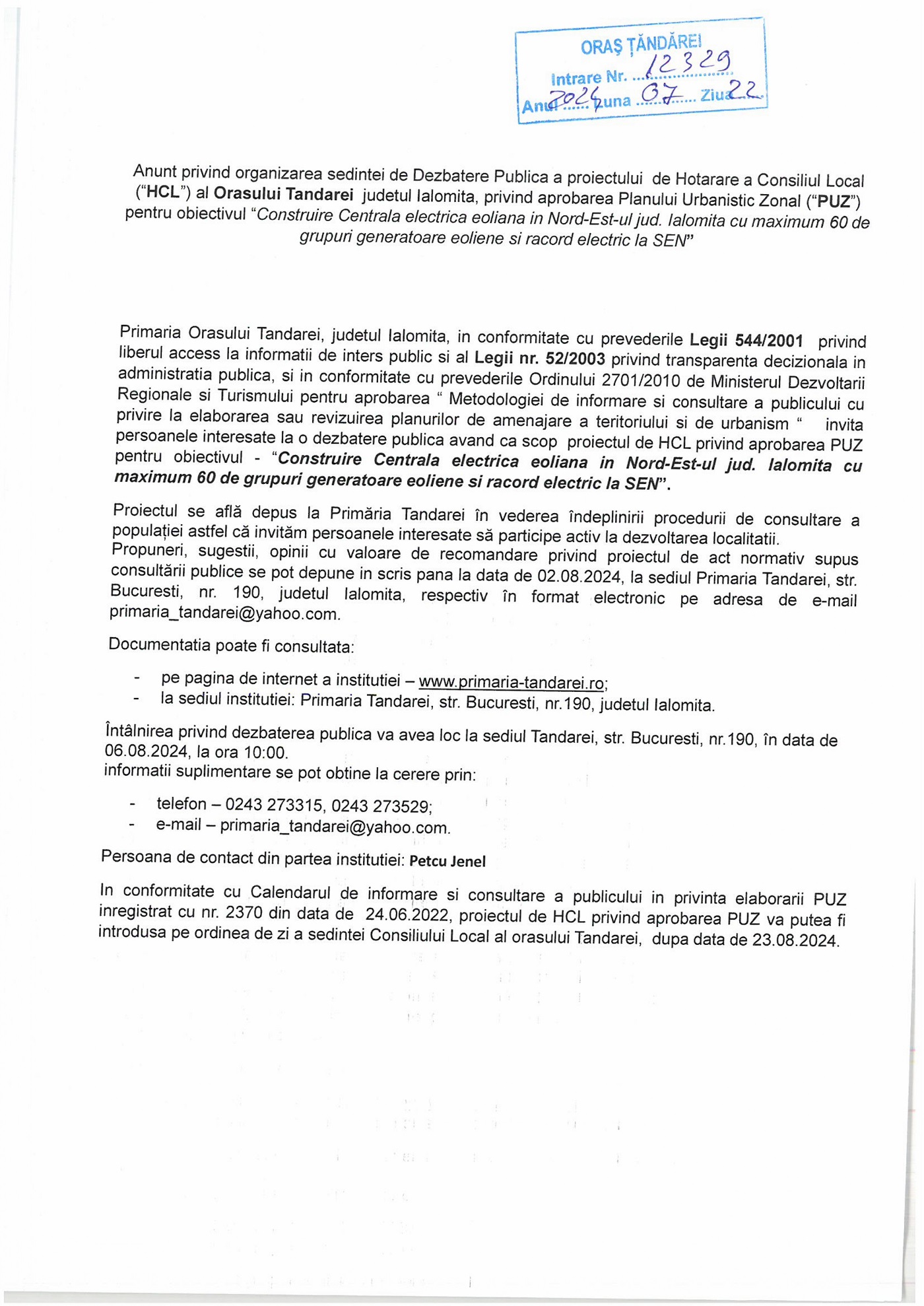 Primăria Țăndărei: Anunț ședință Dezbatere Publică privind aprobare PUZ obiectiv Construire Centrală electrică eoliană în Nord Est-ul jud. Ialomița
