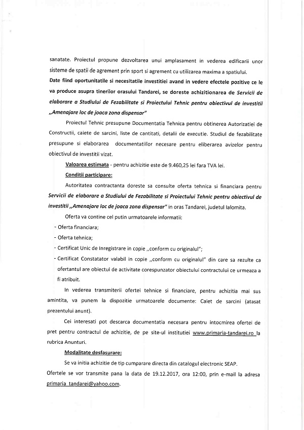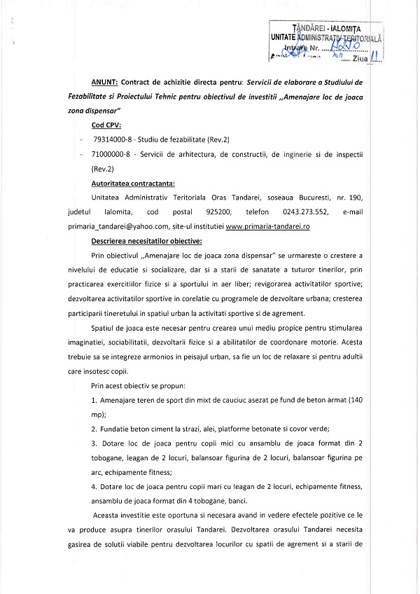 Primăria Țăndărei: Anunt SF și PT pentru obiectivul de investiții ,,Amenajare loc de joacă zona dispensar”