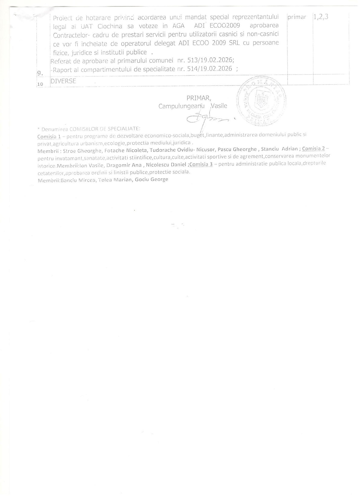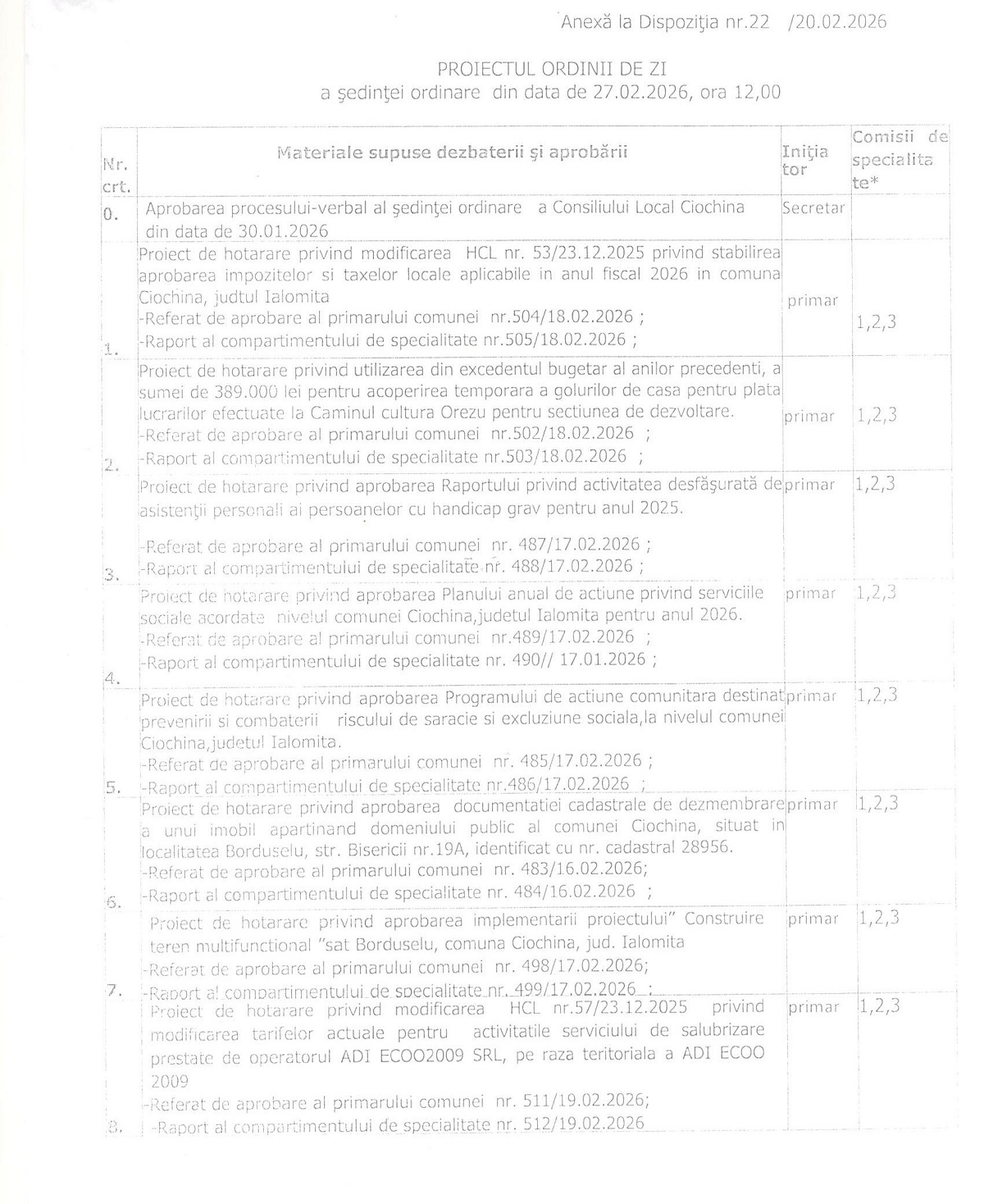 Proiectele de hotărâre ale ședinței ordinare a Consiliului Local Ciochina – Februarie 2026