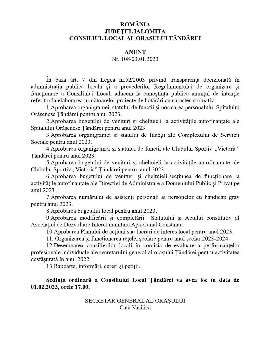 Proiectele de hotărâre supuse aprobării consilierilor Orașului Țăndărei