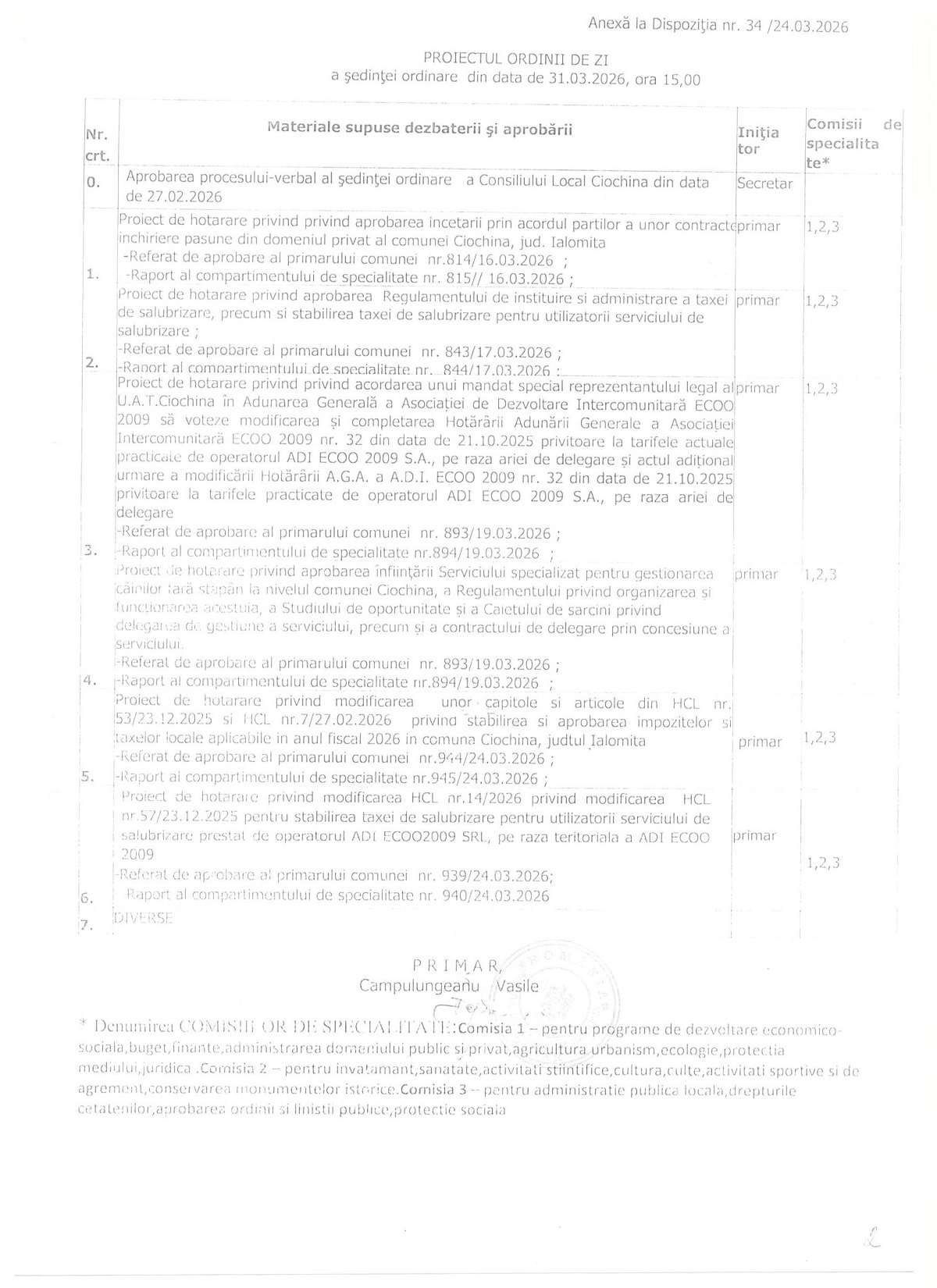 Proiectul ordinii de zi a ședinței ordinare a Consiliului Local Ciochina – Martie 2026