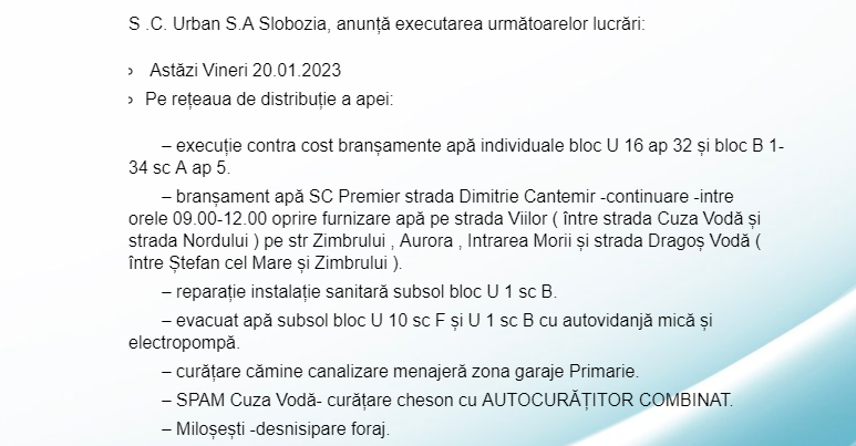 SC URBAN SA Slobozia: Lucrări în cadrul sistemului de alimentare cu apă