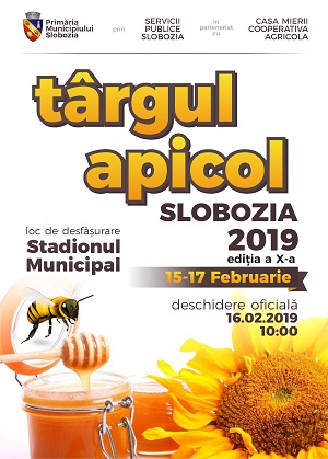 Primăria Municipiului Slobozia, prin Servicii Publice Slobozia S.R.L. și Casa Mierii Ialomița Cooperativa Agricolă, organizează, în perioada 15 -17 februarie 2019, ediția a X-a a Târgului Apicol Slobozia, în incinta Stadionului Municipal.